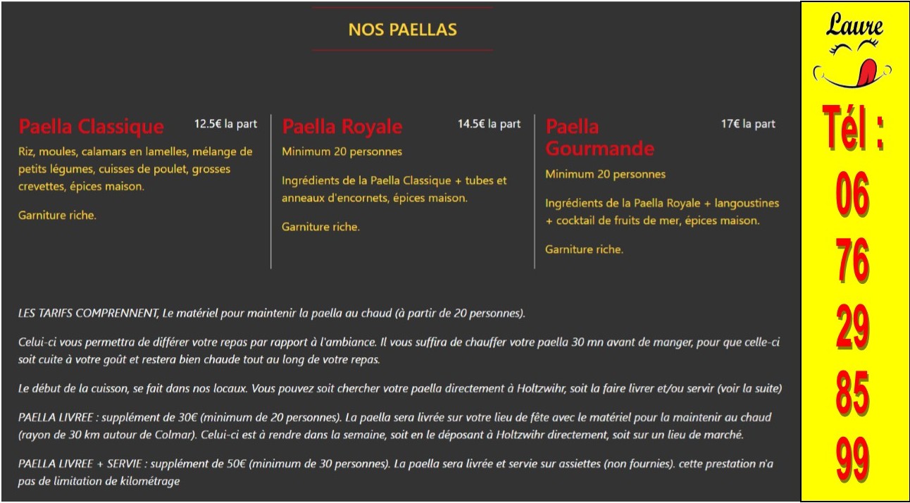 Laure vous régale avec ces délicieuses paellas, un mélange d'épices dont certaines proviennent directement d'Espagne, qui sauront émerveiller vos papilles. Paella à emporter ou en traiteur pour vos repas en famille.